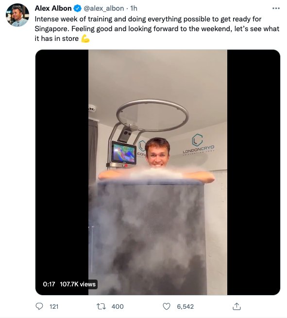 9月28日,威廉姆斯F1车队车手阿尔本在社交媒体上分享了近期训练视频,确认身体已恢复健康并将出战本周末的新加坡大奖赛。阿尔本在三周前的意大利大奖赛赛前突发阑尾炎并接受手术,因此也错过了比赛。在手术后,阿尔本一度出现术后麻醉并发症并导致呼吸衰竭,但在及时接受治疗后脱离危险。