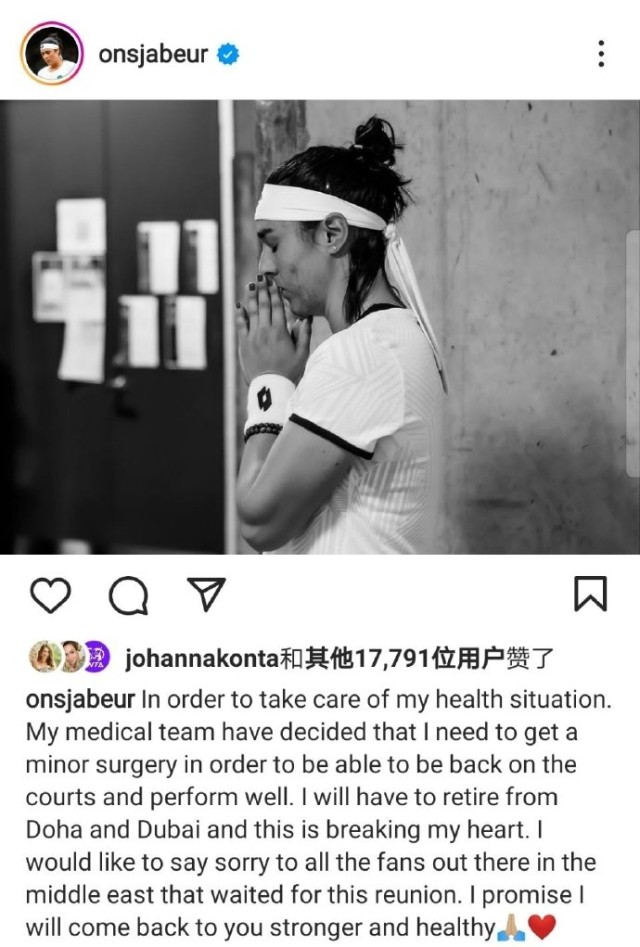 北京时间2月8日,WTA世界第三贾巴尔宣布,出于健康原因将接受小型手术,她也因此退出接下来的WTA500多哈和WTA1000迪拜站。