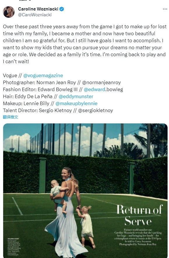 29日,前世界第一沃兹尼亚奇宣布将在今年蒙特利尔赛复出,然后参加美网。她的目标还有巴黎奥运会。她在社交媒体上说:“我想向我的孩子展示无论你的年龄多少,人生角色是什么,都能够去追逐梦想。所以我们全家人一起决定,我要复出参赛,我已经等不及了!”沃兹尼亚奇在2020澳网后退役,她目前育有两个孩子。