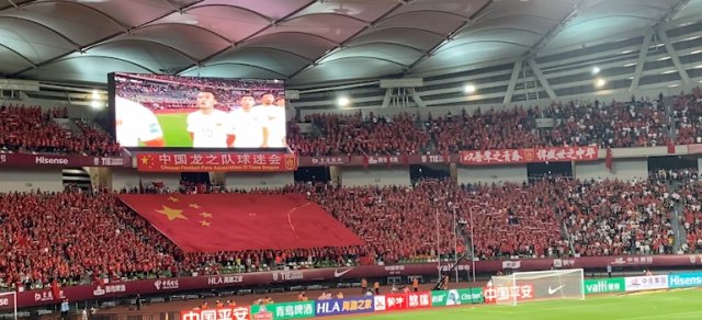 好燃!国足世预赛现场数万名中国球迷齐唱国歌