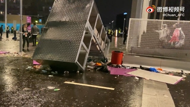 【体坛在现场】决赛战前:球迷爬灯杆,瓶罐散一地