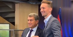 帅气德容正式签约,身披17号红蓝球衣
