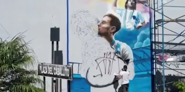 位于布宜诺斯艾利斯的一幅壁画,梅西亲吻美洲杯