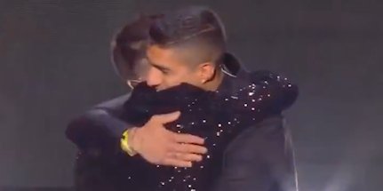 多美好的一幕,苏亚雷斯为梅西颁奖
