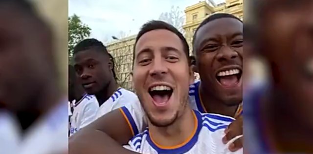 皇马庆典球迷手机扔上车,阿扎尔和阿拉巴留下自拍