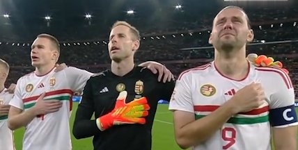在演唱国歌时,匈牙利队队长亚当-绍洛伊泪流满面