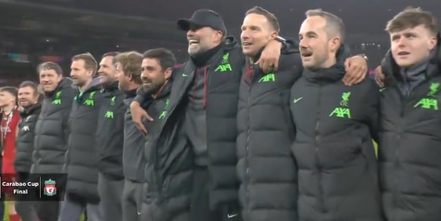 看到凯恩绝杀后,穆勒与图赫尔在场边喜笑颜开