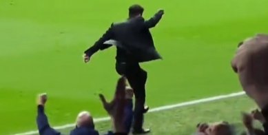 马竞主帅西蒙尼庆祝进球时腿抽筋了,大写的尴尬
