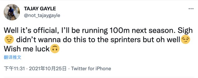 当地时间10月25日,世锦赛跳远冠军、牙买加名将盖尔在社交平台宣布,下赛季将转战男子百米赛场,文中他略带调侃地写道:“这是一则官方声明,下个赛季我将转战 100 米主项,唉不想对短跑运动员们这样做,但好吧,祝我好运。”2019年多哈世锦赛男子跳远决赛,23岁的盖尔成为当届比赛最强黑马,他战胜古巴天才埃切瓦里亚和南非名将曼永加,跳出8.69米的个人最好成绩夺得金牌。目前,他的100米个人最好成绩是10秒81。
